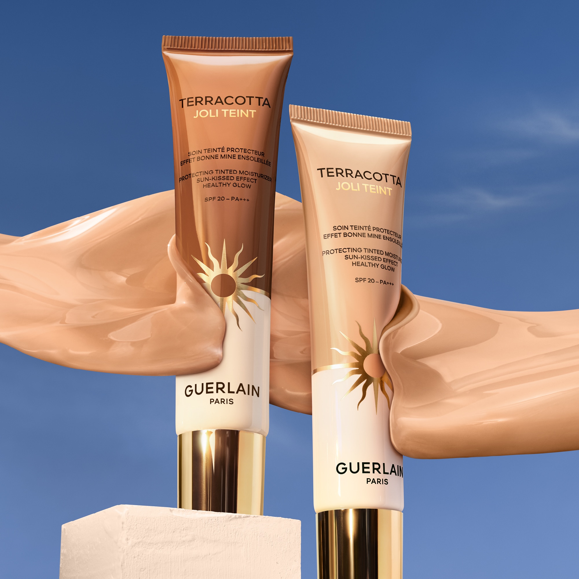 Terracotta Le Teint é uma base matte e luminosa, com cobertura de média a alta. Já Terracotta Le Teint Glow é uma base com acabamento glow saudável e cobertura média. As 30 tonalidades dessas duas bases oferecem um efeito aperfeiçoador tom sobre tom. Terracotta Joli Teint é um hidratante com cor, de cobertura leve e ação protetora, graças ao seu FPS 20 PA+++. Suas 5 tonalidades garantem um efeito sutilmente bronzeado. As três fórmulas proporcionam o mesmo conforto duradouro e alta resistência à transferência.