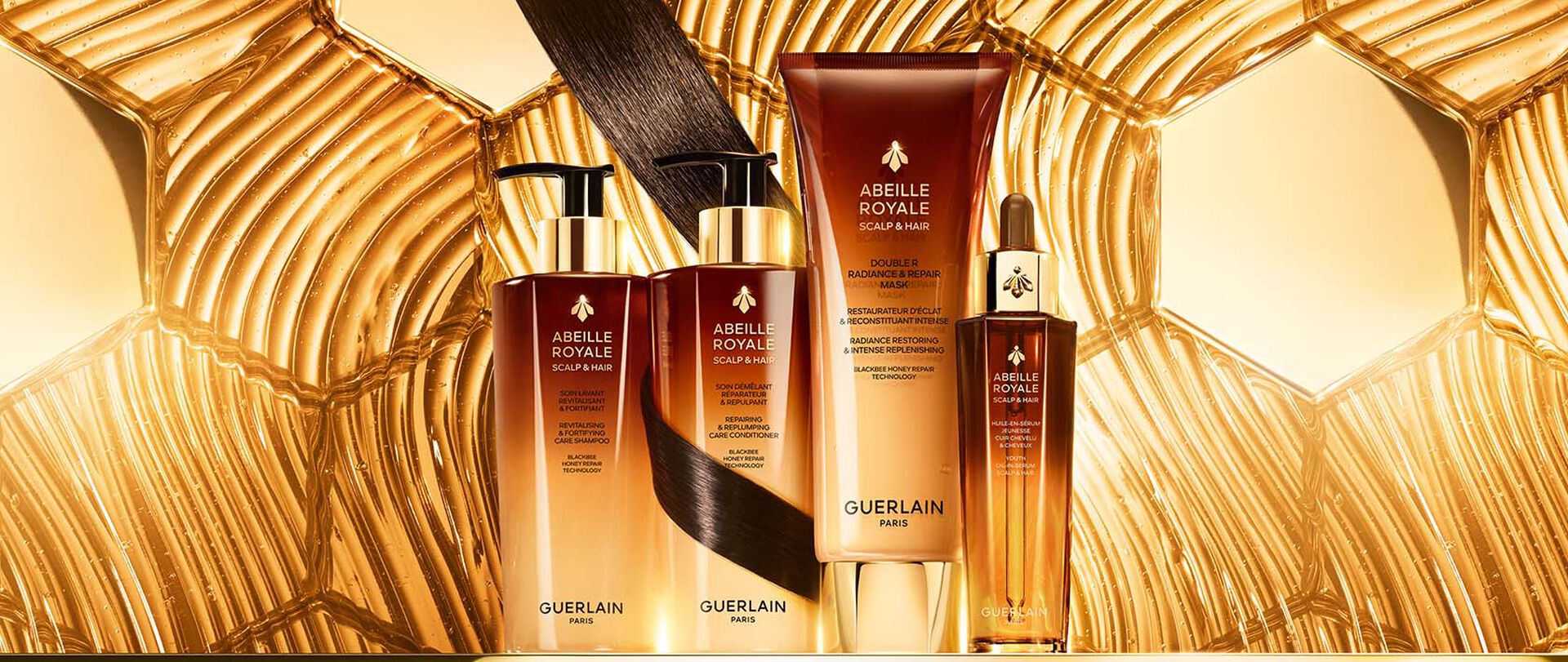 The Abeille Royale ritual for scalp and hair concentrates the power of four repairing honeys identified by Guerlain Research to strengthen the scalp and repair the signs of youthfulness in the hair fibre. Hair is visibly transformed, stronger, shinier and denser.