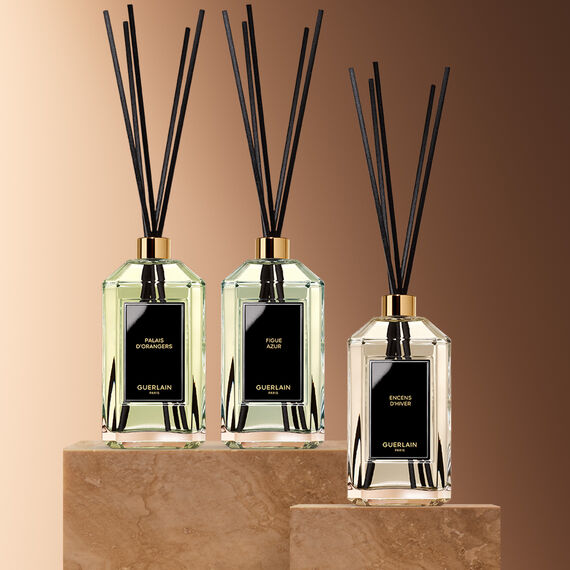 An alternative to candles, Guerlain scented diffusers continuously fragrance your home with L’Art de Vivre scent trails for approximately three months. In order to refresh the fragrance, the replacement stick set lets you refill your diffuser after several weeks of use.